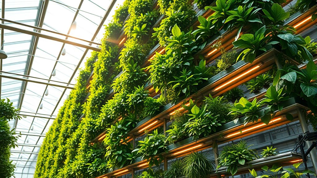 Vertical farming in greenhouses helps you maximize space by stacking crops and integrating advanced technologies like LED lighting, hydroponics, and automation. This setup reduces land use, cuts transportation costs, and enables year-round production right in urban areas. Proper design—including efficient lighting and climate control—ensures healthy, high yields across all levels. If you keep exploring, you’ll discover how to overcome challenges and harness future trends in urban agriculture.