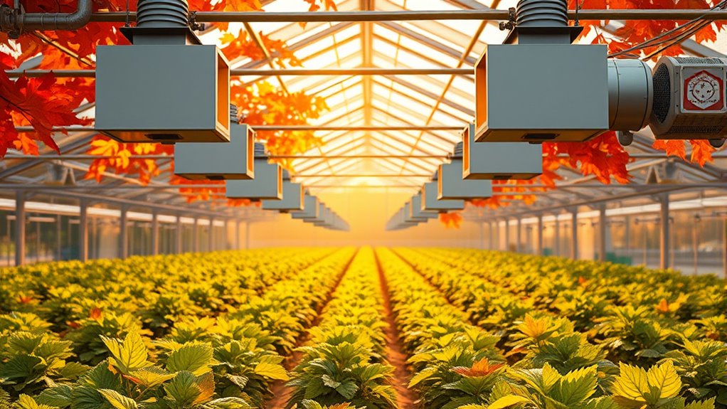 As daylight hours shorten and natural light diminishes during autumn, it’s essential to modify your greenhouse lighting to support healthy plant growth. You should change your lighting schedules to ensure plants receive adequate light for photosynthesis and development. Supplemental illumination can bridge the gap when natural light is insufficient, maintaining consistent growth rates. To optimize your setup, consider the following: