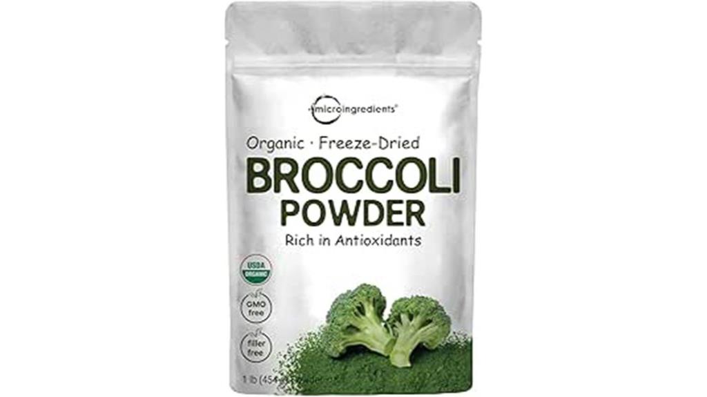 Organic Broccoli Powder stands out as a fantastic choice for health-conscious individuals seeking a convenient way to boost their nutrition. This USDA Organic, freeze-dried superfood is packed with immune-boosting vitamins and minerals while being vegan, non-GMO, and gluten-free. I love how easily it mixes into smoothies, soups, or even scrambled eggs, enhancing my meals without hassle. Though some find the flavor a bit strong, I recommend pairing it with yogurt or other ingredients to balance it out. Despite minor packaging concerns, the quality is impressive, and I trust this brand enough to keep it stocked in my pantry!
