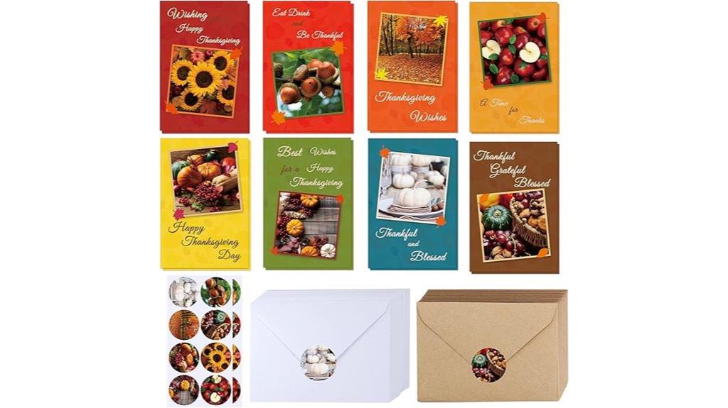 Looking for the perfect way to express gratitude this Thanksgiving? I found the Winlyn Bulk Blank Thanksgiving Cards with Envelopes, and they're fantastic! This set includes 120 cards featuring eight charming autumn designs, perfect for sharing heartfelt messages. Each card has a beautiful, hand-drawn typography and is blank inside, allowing you to personalize your notes. The sturdy cardstock guarantees they'll hold up well, while the matching envelopes add a nice touch. Plus, with 120 stickers included, you can seal your cards with style. These versatile cards are ideal for Thanksgiving and beyond—perfect for spreading joy this harvest season!